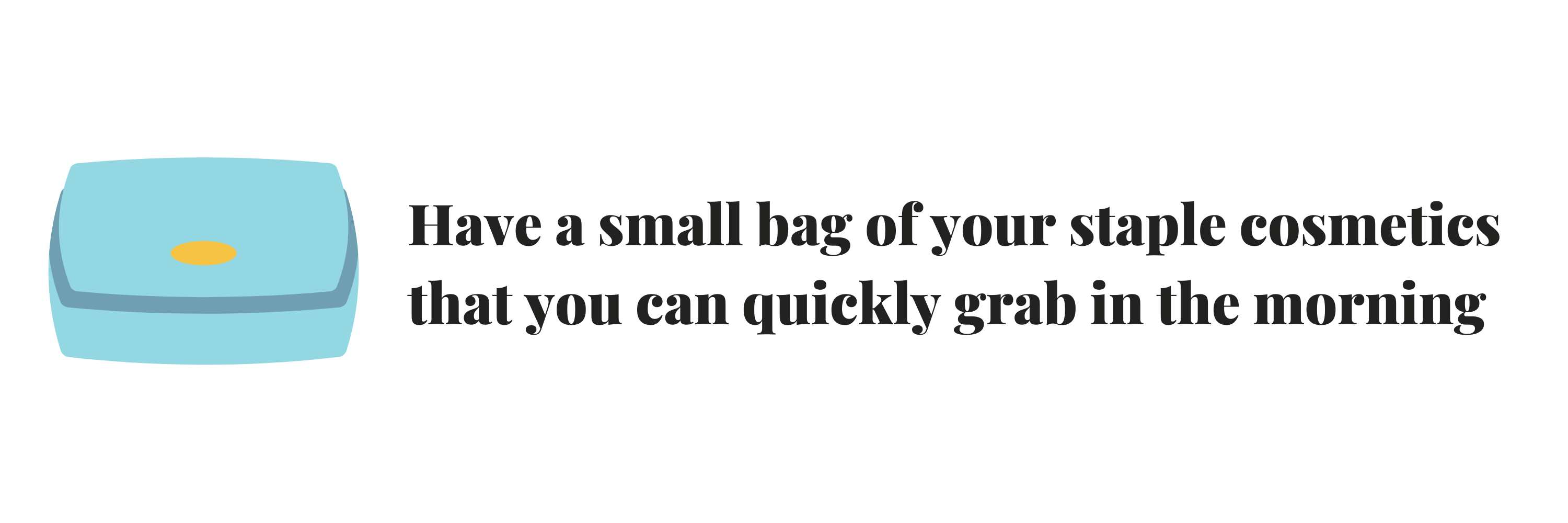 I have a huge makeup and hair cupboard but I typically don’t use everything for a typical work day. I keep a bag with some staples like a hair brush, elastic, mascara, foundation, eyebrow pencil and blush and everything in the bag is all I use to get ready (plus toothbrush). It makes me WAY less stressed as I don’t have to go rummaging through my cupboard looking for things.